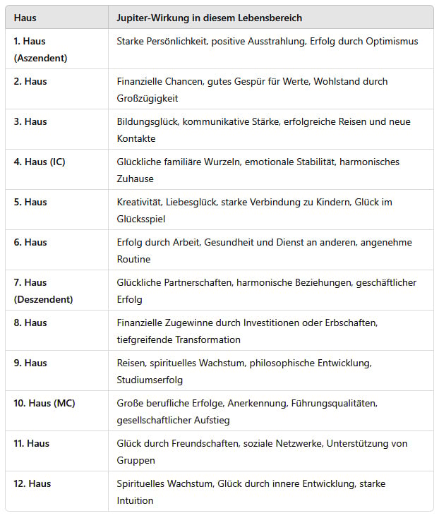 Die Platzierung von Jupiter in einem bestimmten Haus zeigt, in welchem Lebensbereich eine Person die größten Chancen, Erfolge und Wachstumsprozesse erfährt.