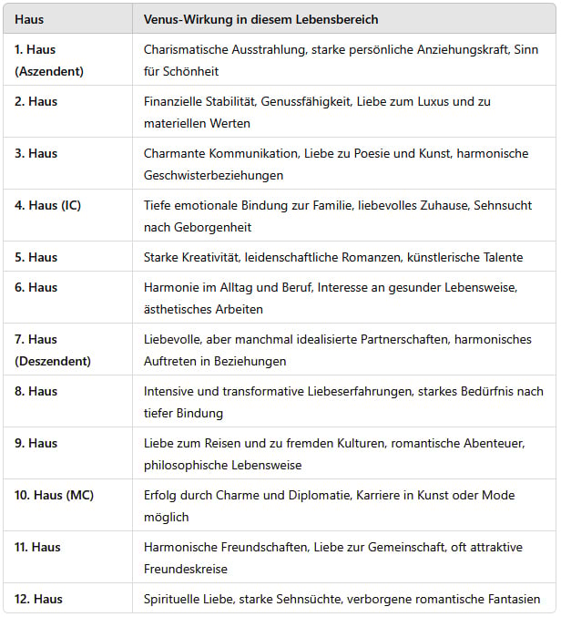 Die Platzierung von Venus in einem bestimmten Haus zeigt, in welchem Lebensbereich eine Person Liebe, Schönheit und Wohlstand erfährt oder Herausforderungen erlebt.