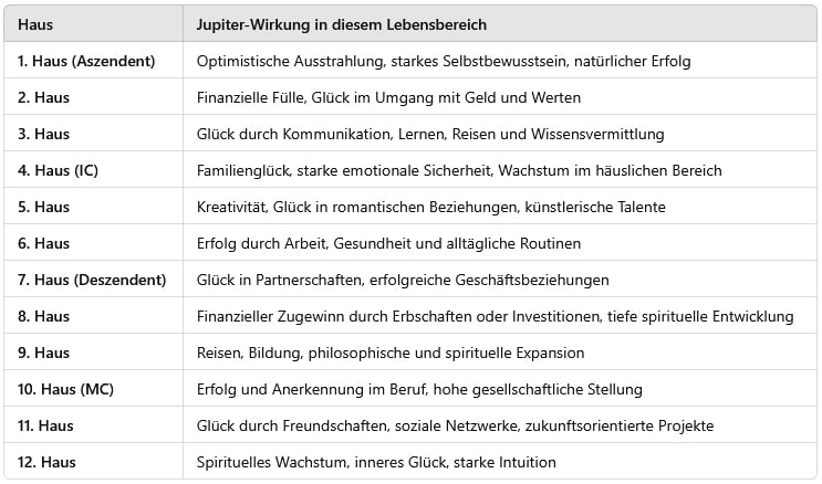 Während Jupiter im Zeichen zeigt, wie jemand Glück und Wachstum erfährt, gibt das Haus, in dem Jupiter steht, Hinweise darauf, in welchem Lebensbereich diese Expansion am stärksten wirkt.