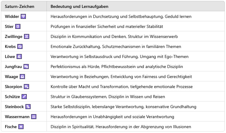 Die Position von Saturn im Tierkreiszeichen zeigt, wo und wie eine Person mit Herausforderungen konfrontiert wird und wie sie Disziplin und Verantwortung entwickelt.