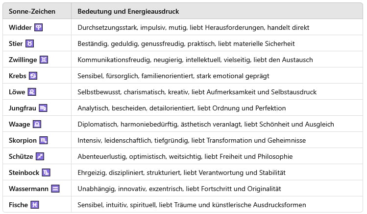 Die Sonne ist das zentrale Element in der klassischen Astrologie und symbolisiert das Bewusstsein, die Identität, die Lebenskraft und das persönliche Selbst. Sie steht für das Ich-Bewusstsein, den inneren Antrieb und das schöpferische Potenzial eines Menschen. Während der Mond für die emotionale und unbewusste Seite steht, verkörpert die Sonne das bewusste Selbst, die Persönlichkeit und die Lebensaufgabe.