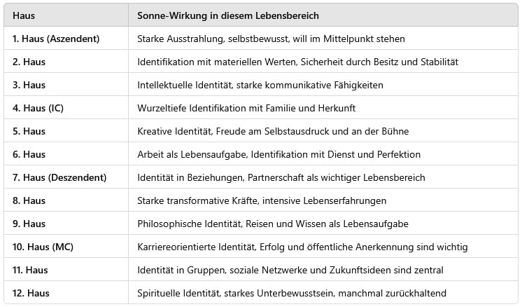 Während die Sonne im Zeichen zeigt, wie jemand seine Persönlichkeit ausdrückt, gibt das Haus, in dem die Sonne steht, Hinweise darauf, in welchem Lebensbereich sich diese Identität besonders stark entfaltet.